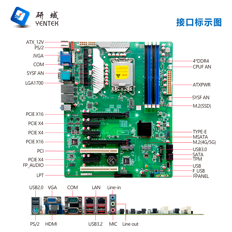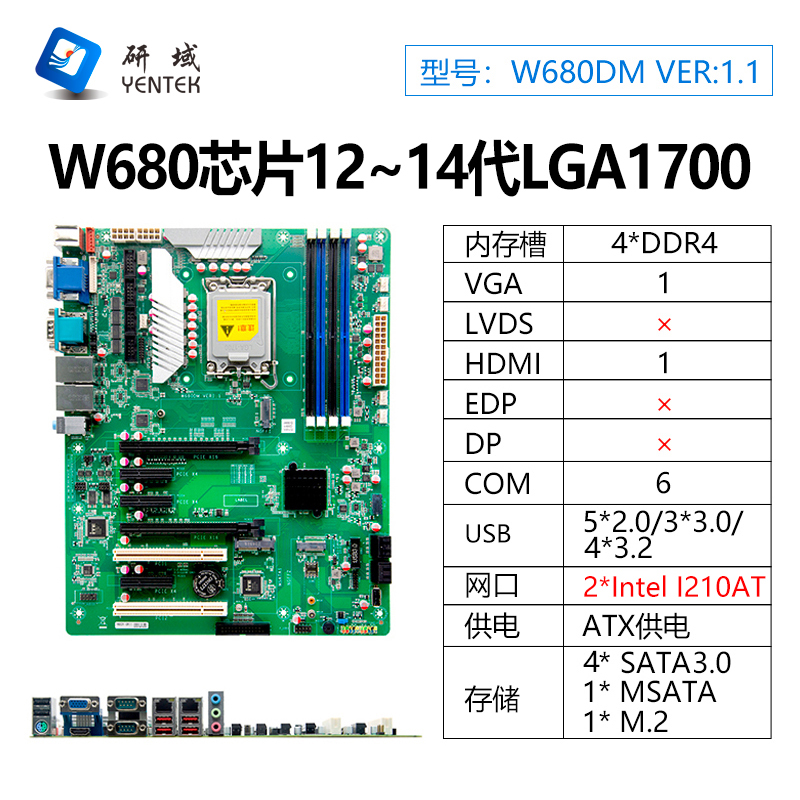 ◆支持LGA1700 12th/13/14th Intel® Core™ i3/i5/i7/i9 Alder Lake-S and Raptor Lake - S处理器 ◆采用Intel® W680芯片组 ◆4*DDR4 DIMM内存插槽,支持双通道最高3200MHz内存,最大支持128GB,支持ECC内存 ◆1*VGA,2*HDMI ◆2*Intel ®I210AT千兆网卡芯片, ◆4*SATA3.0,1*MSATA,1*M.2支持SSD,1*M.2支持5G ◆2* PCIE4.0 X16,3* PCIE X4,2* PCI ◆4* USB3.2,5*USB2.0,2*USB3.0