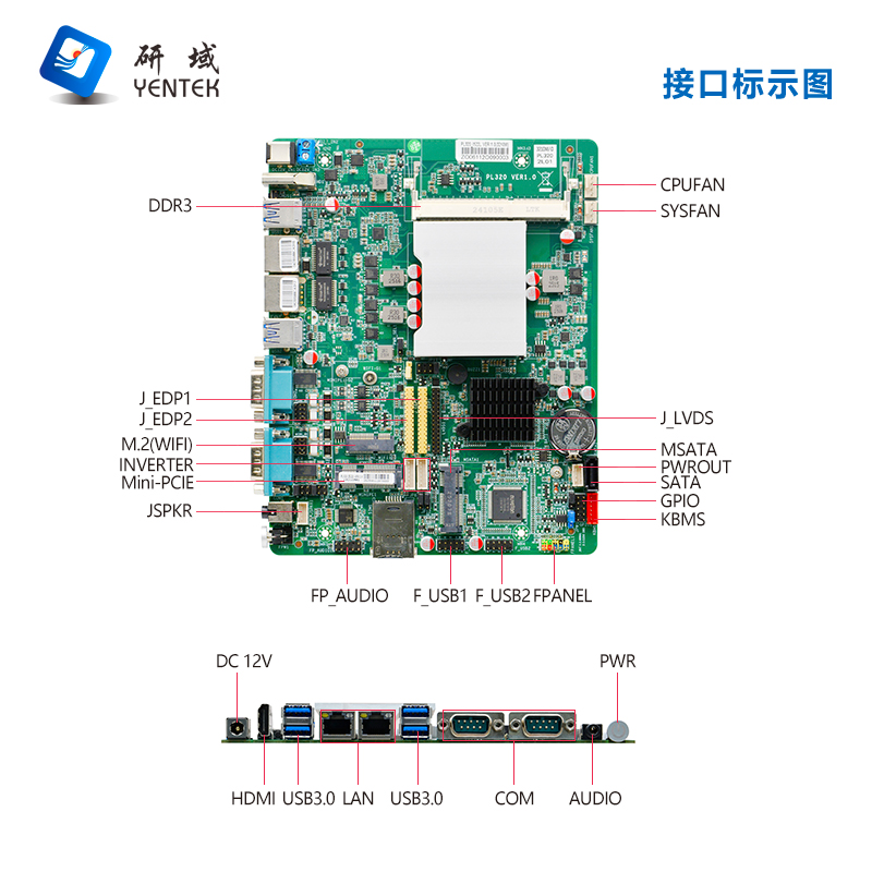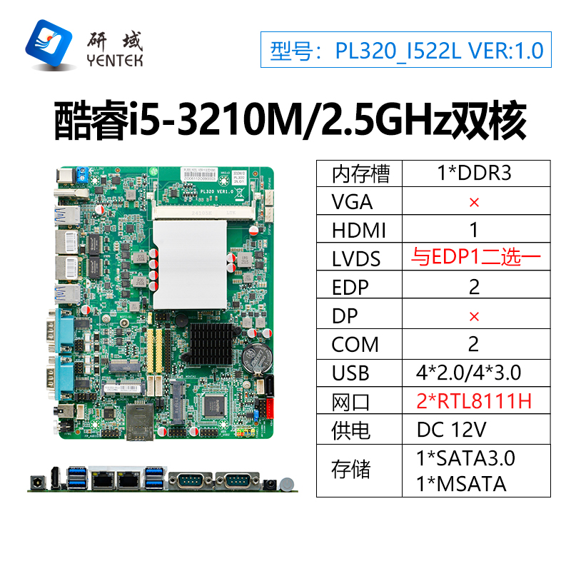 ◆集成Intel®Core I5-3210M 主频2.5GHz ,TDP 18W ◆Intel® HM77高速芯片组 ◆1*SODDR3内存插槽 ◆1*VGA、1*HDMI、2*EDP、1* LVDS显示接口 ◆2*RTL8111H千兆网卡,支持网络唤醒、PXE功能 ◆1* 7pin SATA3.0、1*MSATA硬盘接口 ◆1*M.2 KEY-E插槽,支持WIFI功能 ◆1* Mini-PCIE插槽,支持WIFI/4G ◆1*COMS清零按键 ◆8*USB接口 ◆2*DB9 COM口,支持RS232/RS485(支持带电和隔离功能)